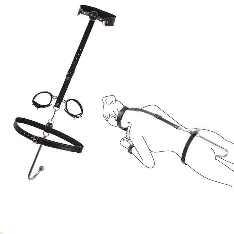 This all-in-one BDSM bondage kit combines a mouth gag, handcuffs, and a stainless steel anal hook designed for reverse-hand restraint play. It provides a thrilling way to experience ultimate submission and control during BDSM sessions.
